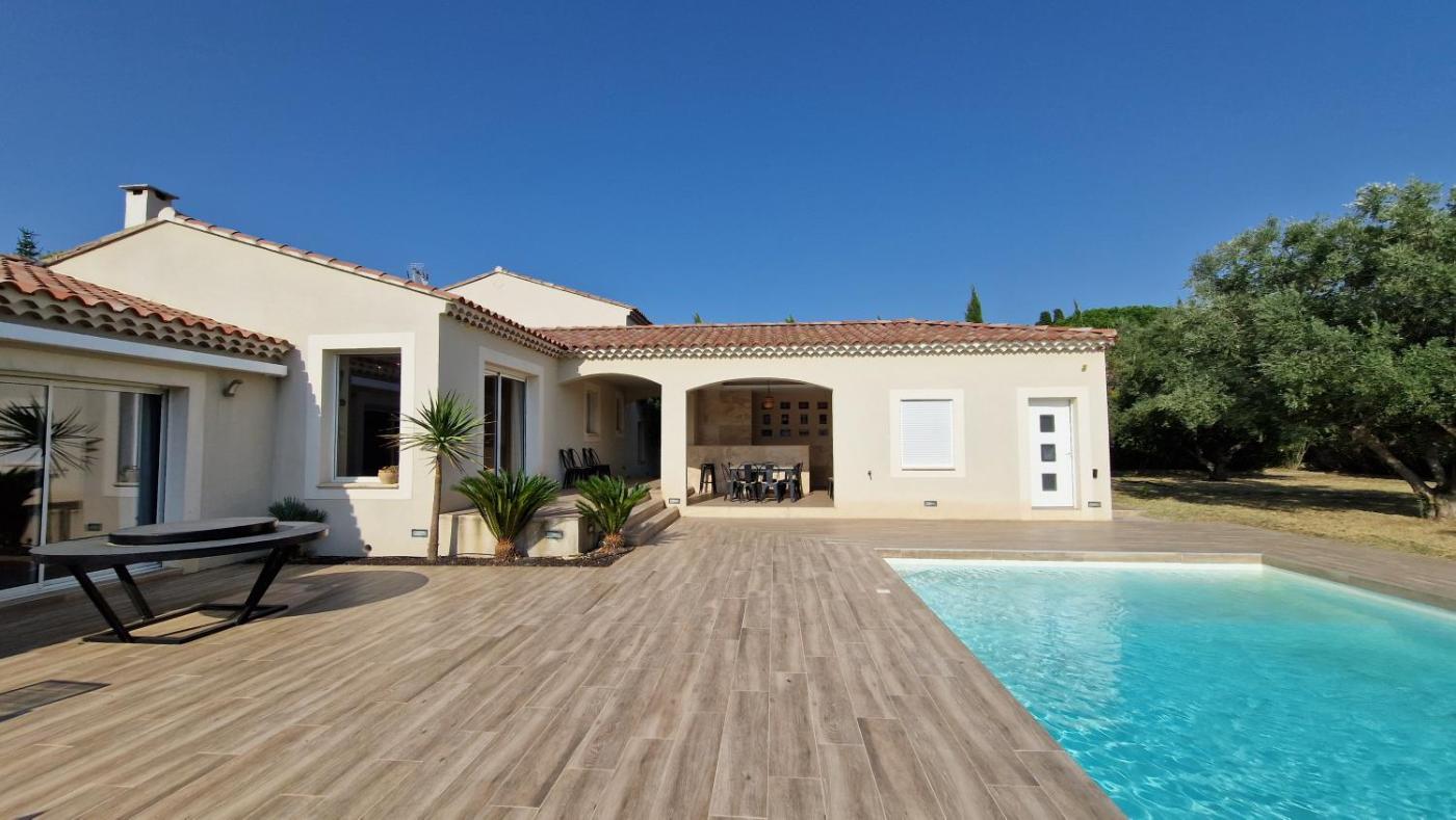 Villa. The private pool and fireplace are the special features of this villa. Boasting a private entrance, this spacious villa also comes with 5 bedrooms, a seating area and 3 bathrooms with a bath and a shower. Guests will find a stovetop, a refrigerator, a dishwasher and kitchenware in the well-equipped kitchen. The villa also includes a barbecue. This air-conditioned villa is comprised of a dining area, a flat-screen TV with streaming services a washing machine and a terrace. The unit has 8 beds.